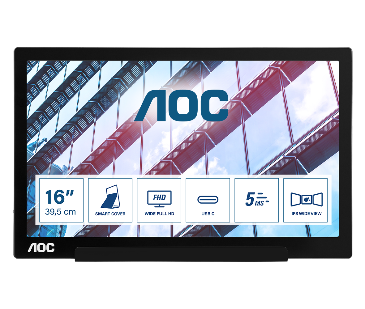 Portable, elegant solution The I1601 looks gorgeous and is durable with its metal alloy case. While being just 8.5 mm thick and weighing ultra-light 800 g it is easy to travel with for work or study. It also easily fits in most notebook bags. Ultra-light aluminum design Functional connectivity, full productivity, and extreme portability in only 800 grams, with a sleek design and aluminum back. With a light weight and an easy-to-handle size, you can always be efficient… anytime, anywhere, with no side hassles and bothers. One cable solution USB-C + USB displaylink More on-screen estate is just a cable away. Thanks to the hybrid connection, you can easily connect your laptop to the portable monitor. Specifically, if your laptop has a USB-C port compatible with DP alt, you may use USB-C. If not, you can connect via USB with the DisplayLink technology in our portable monitor. Travelling and commuting If you work on the go, whether you’re commuting or often working far from home, you need to boost your productivity in places and situations when a complete desktop setup is just impossible and unlikely to have. With the lightweight and easy-to-handle size of AOC portable monitors, you can always be efficient … anytime, anywhere. Working has never been so easy: when visiting your customers, their ergonomics help you focus on the core of your meetings! Business meetings An AOC portable monitor is the perfect solution for business meetings. You can share with your customers and partners a document, or a presentation, while keeping an eye on all other apps you need for work on your laptop. This helps in delivering tasks with no distractions, for you and your audience. Home use – Solve the “too little space issues” Sometimes a traditional monitor is not what you’re really looking for, the more so if you live in a small apartment and you can’t have a complete desktop layout. But AOC has the perfect solution, in roughly 16”, that can assure you more screen space and more comfort. Home use – Multi setup Portable monitors are also worthy allies in multi-monitor set-ups at home. They are a space-efficient and powerful solution that can be used in your home setup for complete and extensive visualization, but also a solution that can fit everywhere in your house for any need. Thanks to a single USB cable that transfers data to the screen and acts as an energy-efficient power source, you can enhance your work efficiency while maintaining a clear and sleek desk for a stylish solution for any workplace or home interior. Smart cover The included smart cover protects your display inside or outside your bag against dirt and damage. When the display is in use, the cover acts as a flexible screen holder, in portrait or landscape mode. IPS Panel IPS panel ensures an excellent viewing experience with lifelike yet brilliant and accurate colours. Colours look consistent no matter from which angle you look at the display FHD Resolution Want to watch a Blu-ray movie in full quality, enjoy games in high resolution or read crisp text in office applications? Thanks to its Full HD resolution of 1920 x 1080 pixels, this monitor lets you do just that. Whatever you are viewing, with Full HD it will be displayed in rich detail without requiring a high-end graphics card or consuming a lot of your system’s resources. Auto-Pivot Change the orientation of the monitor to automatically align screen content (included AOC i-Menu software needed to activate). |