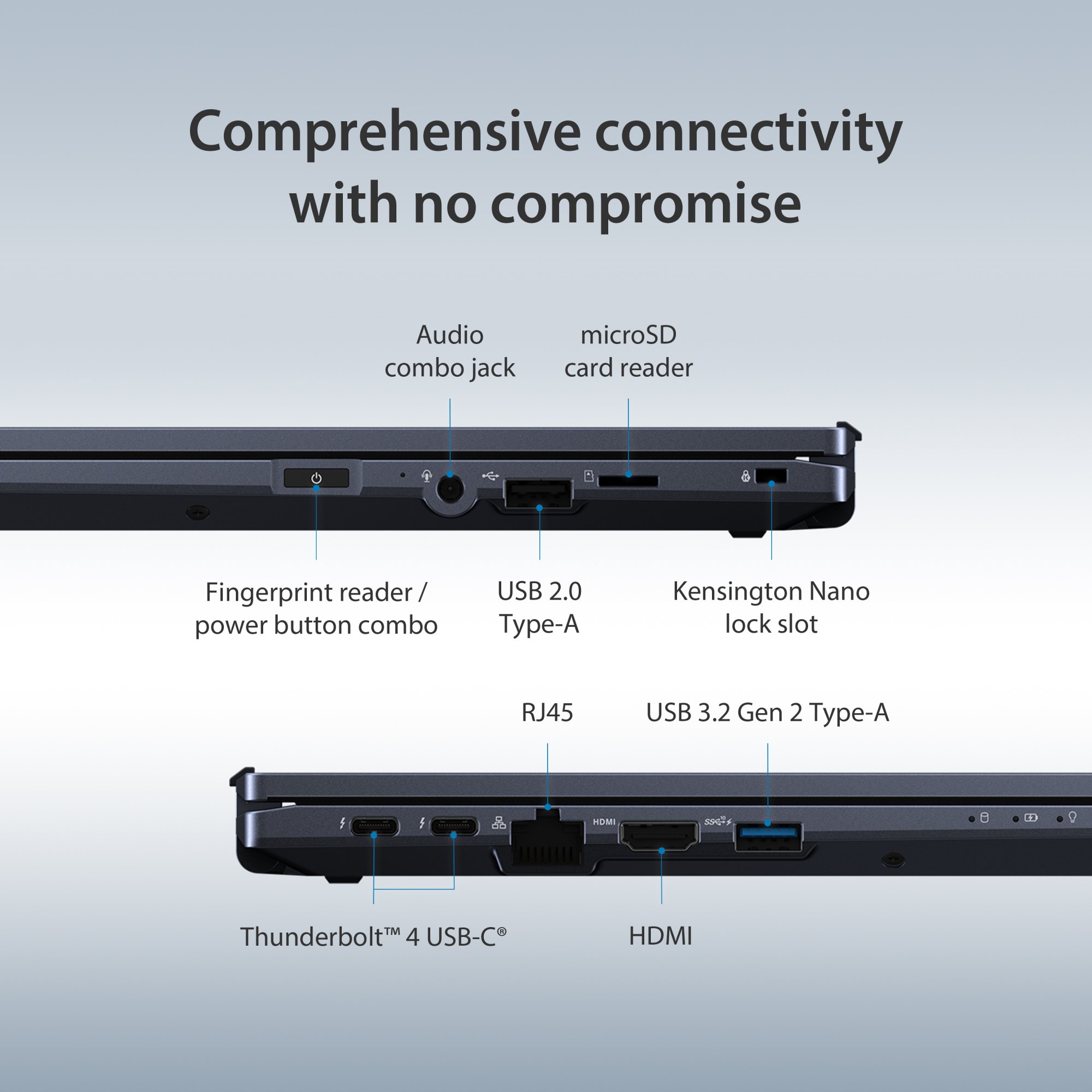 Despite its thin profile, ExpertBook B5 OLED is loaded with I/O ports. These include cutting-edge Thunderbolt™ 4, the next generation of the universal cable connectivity solution that offers support for the next-level USB 4 interface, 40 Gbps data transfer speeds, 4K display output and fast charging. The laptop also offers a microSD card reader and an HDMI output, plus an RJ45 Ethernet port, with a unique MAC address for easy device management.