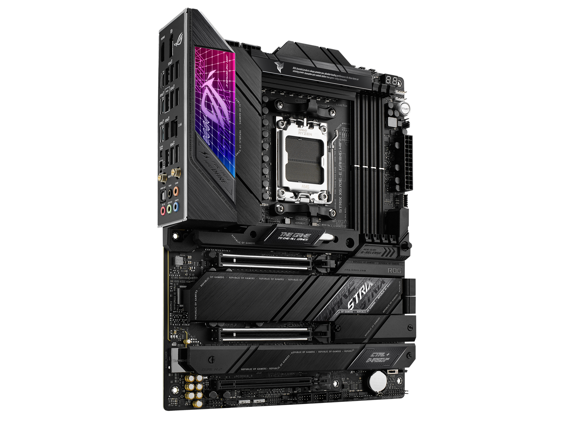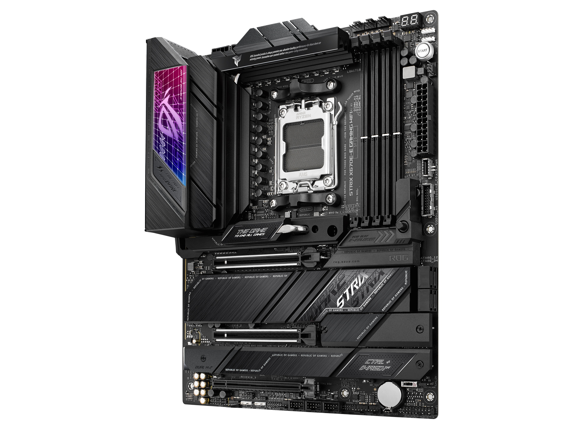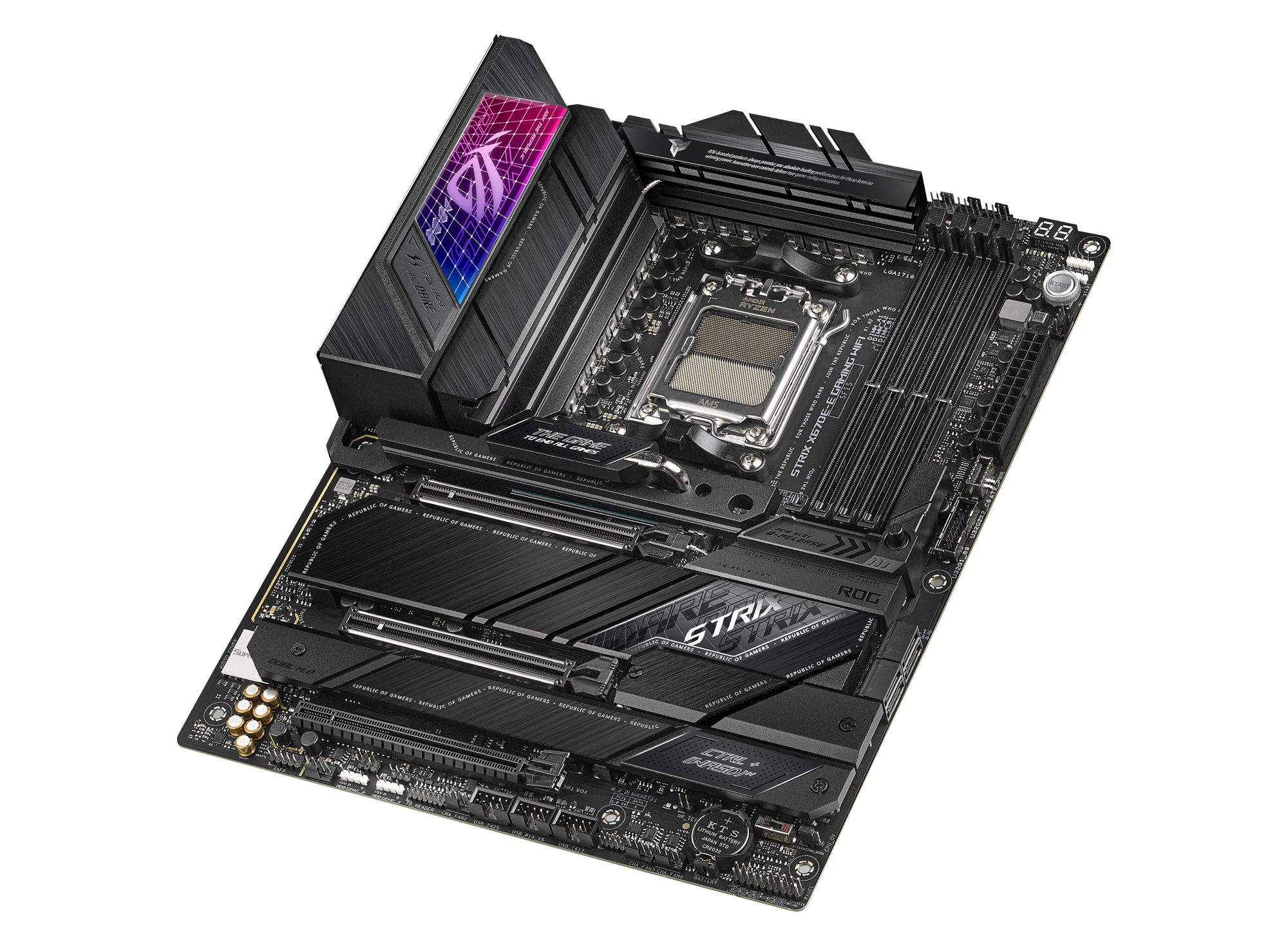 ASUS ROG STRIX X670E-E GAMING WIFI. Processor manufacturer: AMD, Processor socket: Socket AM5, Compatible processor series: AMD Ryzen™ 7. Supported memory types: DDR5-SDRAM, Maximum internal memory: 192 GB, Memory slots type: DIMM. Supported storage drive interfaces: M.2, SATA III, Supported storage drive types: HDD & SSD, RAID levels: 0, 1, 10. Ethernet interface type: 2.5 Gigabit Ethernet, Top Wi-Fi standard: Wi-Fi 6E (802.11ax), Wi-Fi standards: 802.11a, 802.11b, 802.11g, Wi-Fi 4 (802.11n), Wi-Fi 5 (802.11ac), Wi-Fi 6 (802.11ax), Wi-Fi 6E.... Component for: PC, Motherboard form factor: ATX, Motherboard chipset family: AMD |