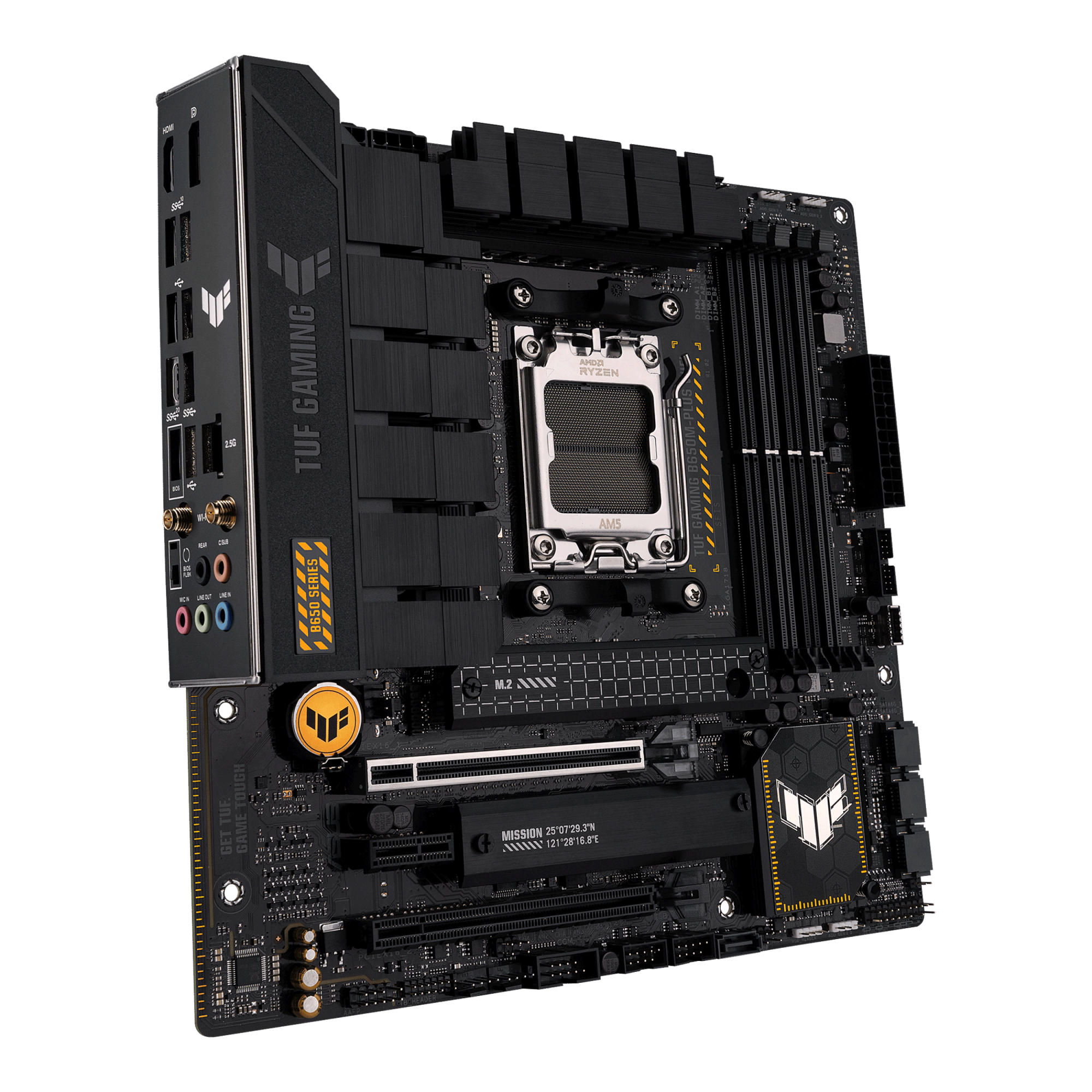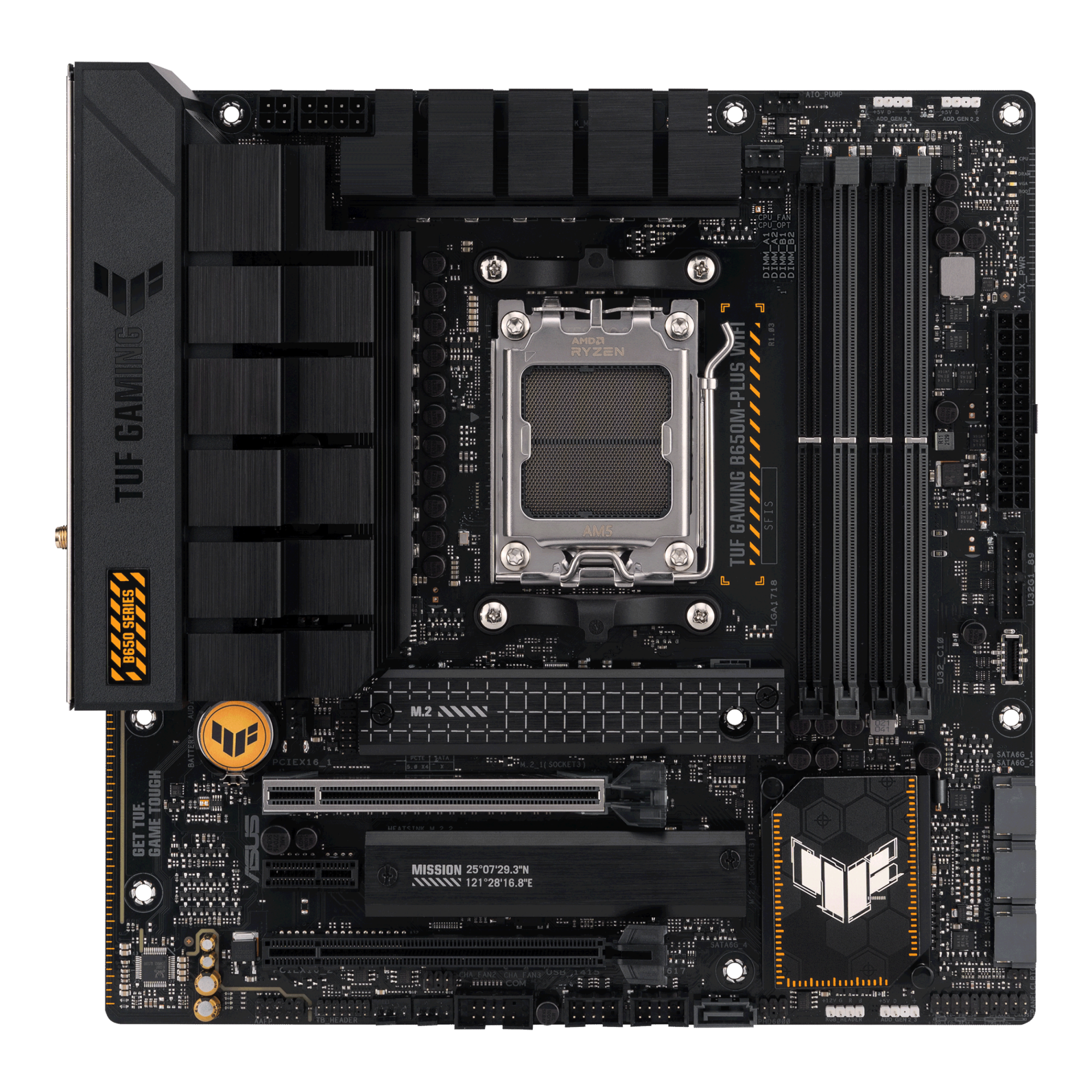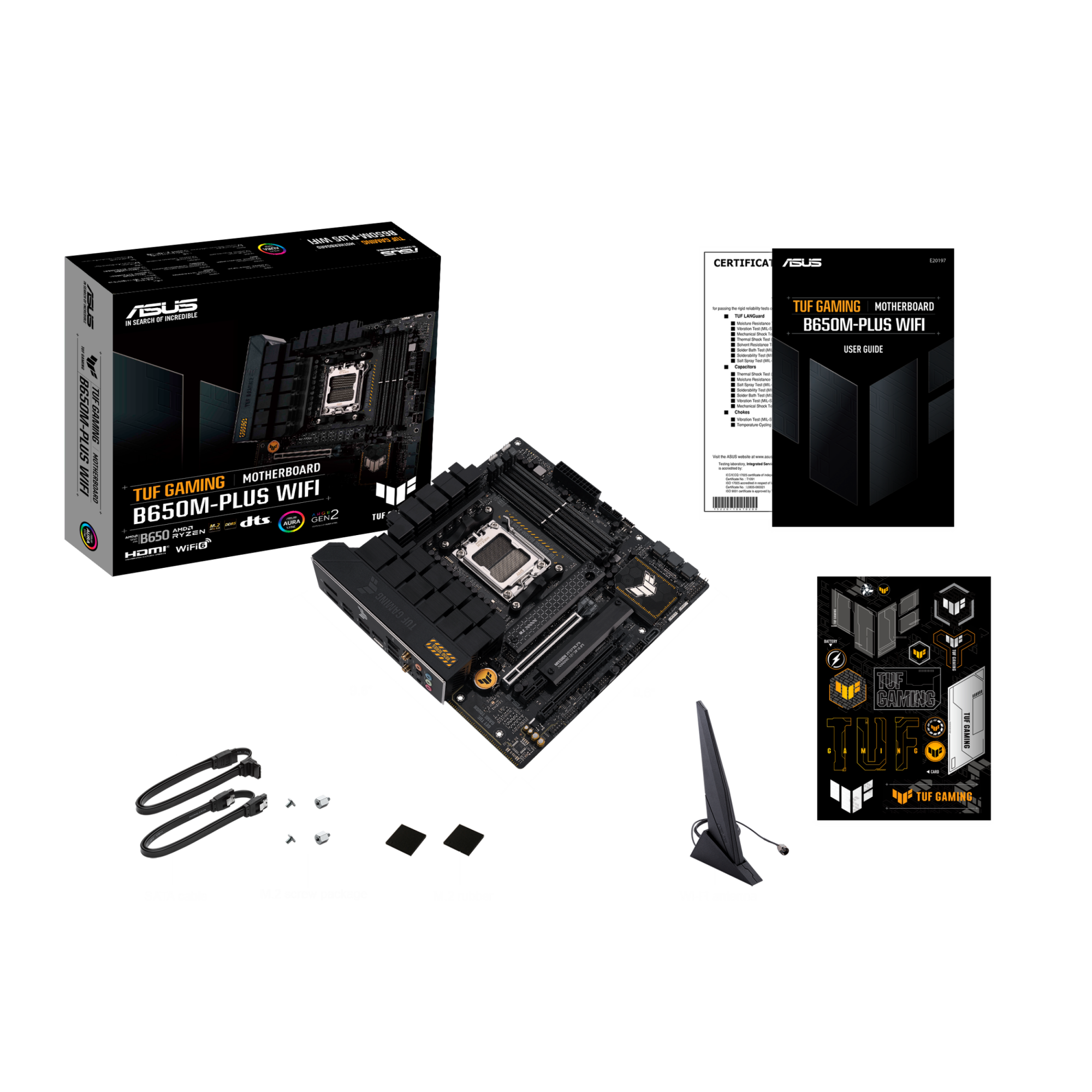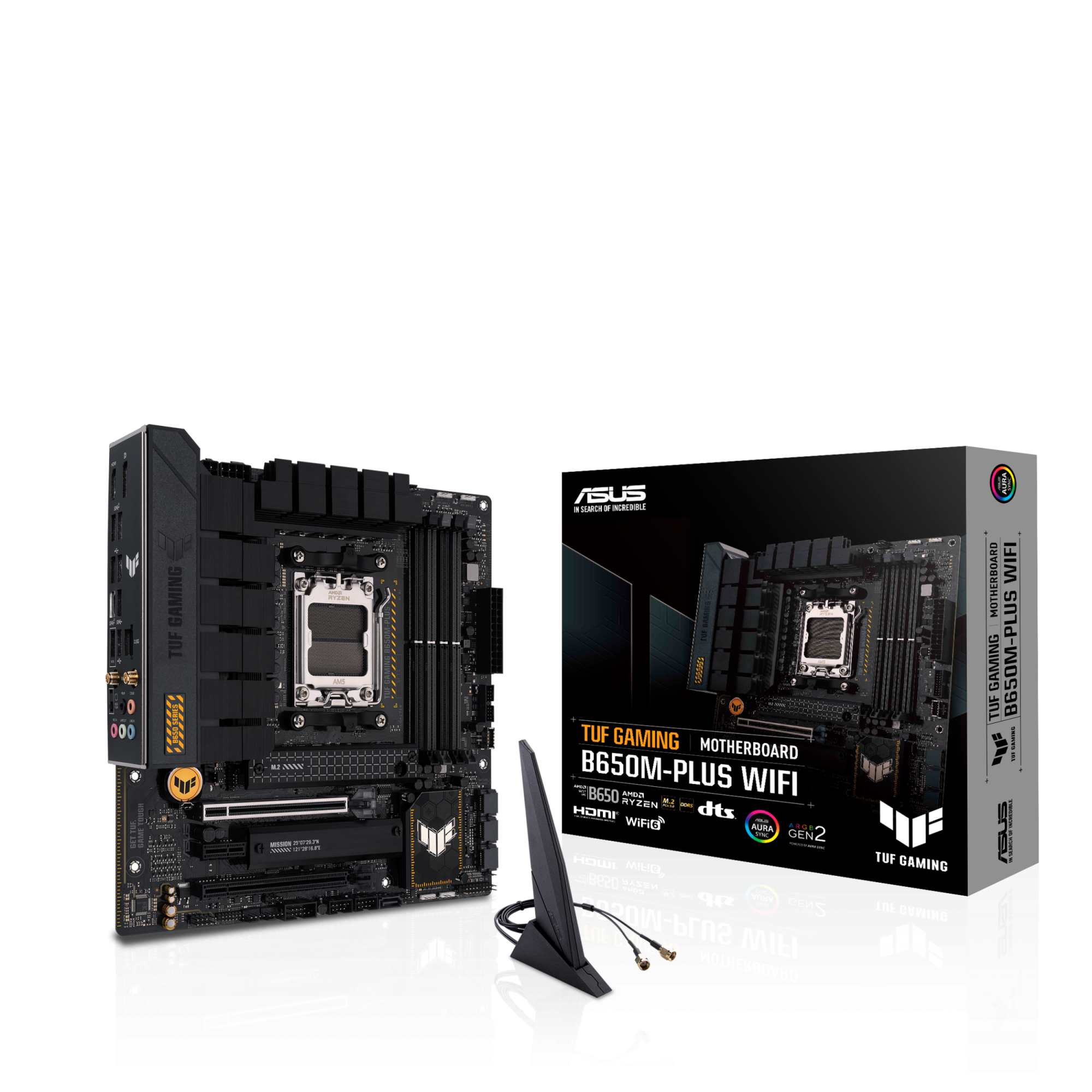 ASUS TUF GAMING B650M-PLUS WIFI. Processor manufacturer: AMD, Processor socket: Socket AM5. Supported memory types: DDR5-SDRAM, Maximum internal memory: 128 GB, Memory slots type: DIMM. Supported storage drive interfaces: M.2, SATA III, Supported storage drive types: HDD & SSD, RAID levels: 0, 1, 10. Ethernet interface type: 2.5 Gigabit Ethernet, Fast Ethernet, Gigabit Ethernet, Top Wi-Fi standard: Wi-Fi 6 (802.11ax), Wi-Fi standards: 802.11a, 802.11b, 802.11g, Wi-Fi 4 (802.11n), Wi-Fi 5 (802.11ac), Wi-Fi 6 (802.11ax). Component for: PC, Motherboard form factor: micro ATX, Motherboard chipset family: AMD |