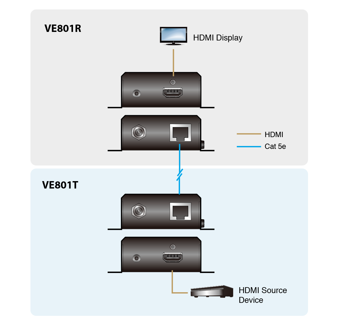 Extends HDMI signals over a single Cat 5e/6/6a cable or ATEN 2L-2910 Cat 6 cable