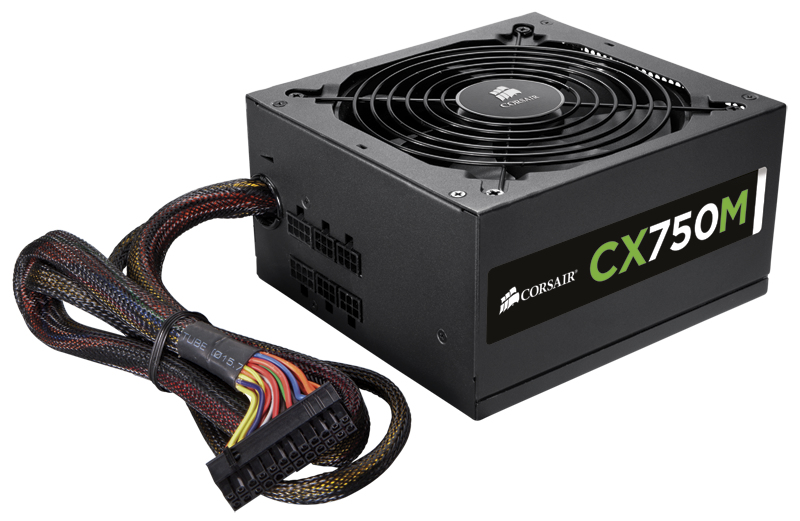 Corsair CX 750M. Total power: 750 W, AC input voltage: 100 - 240 V, AC input frequency: 47 - 63 Hz. Motherboard power connector: 24-pin ATX, Cabling type: Semi-Modular. Purpose: PC, Power supply unit (PSU) form factor: ATX, 80 PLUS certification: 80 PLUS Bronze. Product colour: Black. Width: 150 mm, Depth: 160 mm, Height: 86 mm
