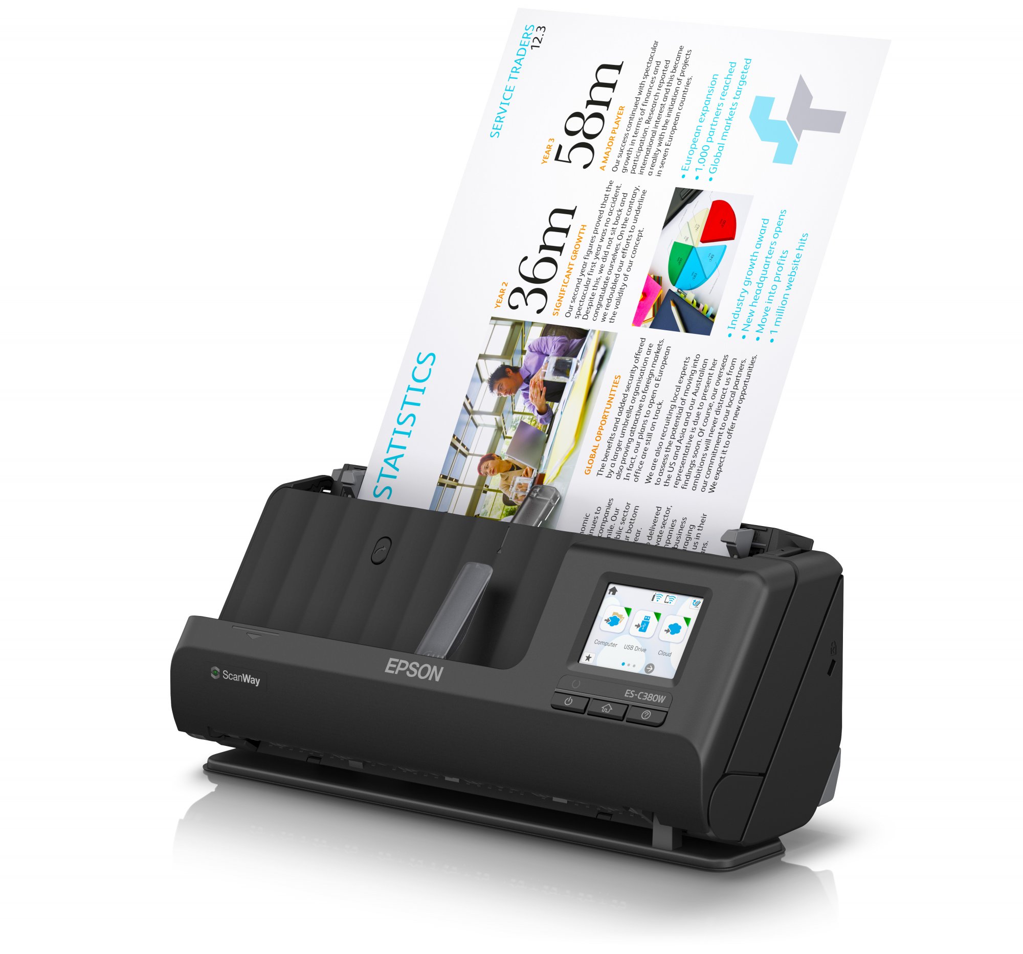 Epson ES-C380W. Maximum scan size: 215.9 x 5588 mm, Optical scanning resolution: 600 x 600 DPI, Input colour depth: 30 bit. Scanner type: ADF + Sheet-fed scanner, Product colour: Black, Control type: Buttons. Daily duty cycle (max): 3500 pages, Light source: ReadyScan LED, Scan to: E-mail, FTP, Network folder, Print. Standard input capacity: 20 sheets. Maximum ISO A-series paper size: A4, Scanning media types supported: Business Card, Plastic Card, Post Card(JPN), ISO A-series sizes (A0...A9): A4, A5, A6