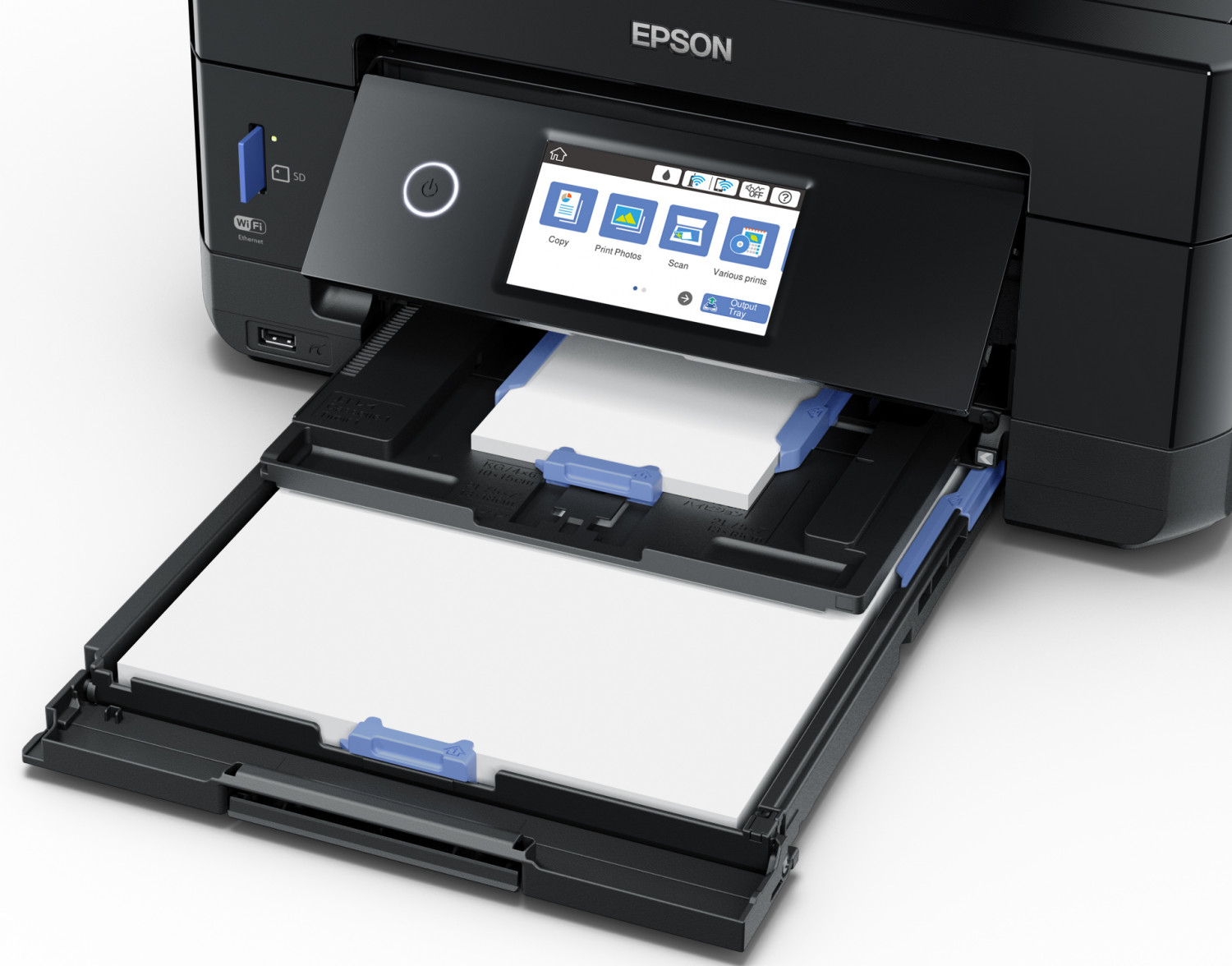 Flexible paper trays: Two front-loading trays and a rear feed