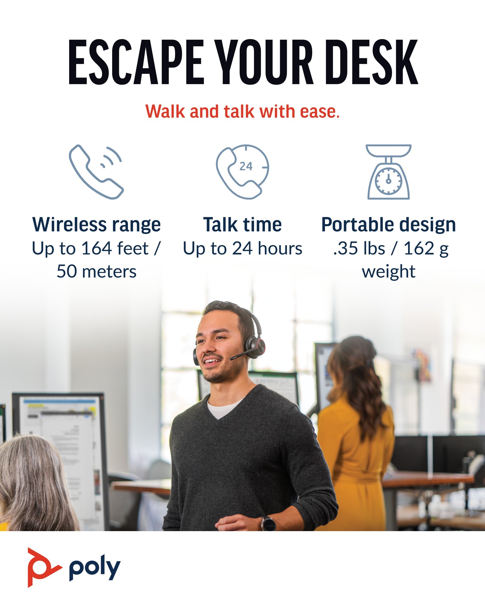 Boost your productivity with continuous comfort, up to 24 hours of talk time, and connectivity to multiple devices. Extend your talk time by using the desktop charge stand or by using the headset in the corded USB mode.[1,2]