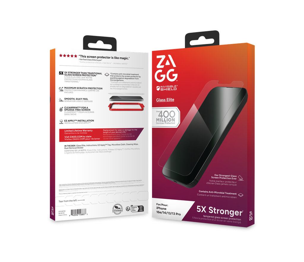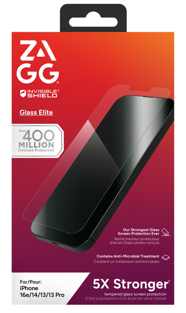 InvisibleShield Glass Elite Apple iPhone 17e/16e/14/13/13 Pro. Brand compatibility: Apple, Compatibility: iPhone 17e/16e/14/13/13 Pro, Protection features: Anti-bacterial, Drop proof, Dust resistant, Scratch resistant. Material: Tempered glass, Product colour: Transparent. Quantity per pack: 1 pc(s)