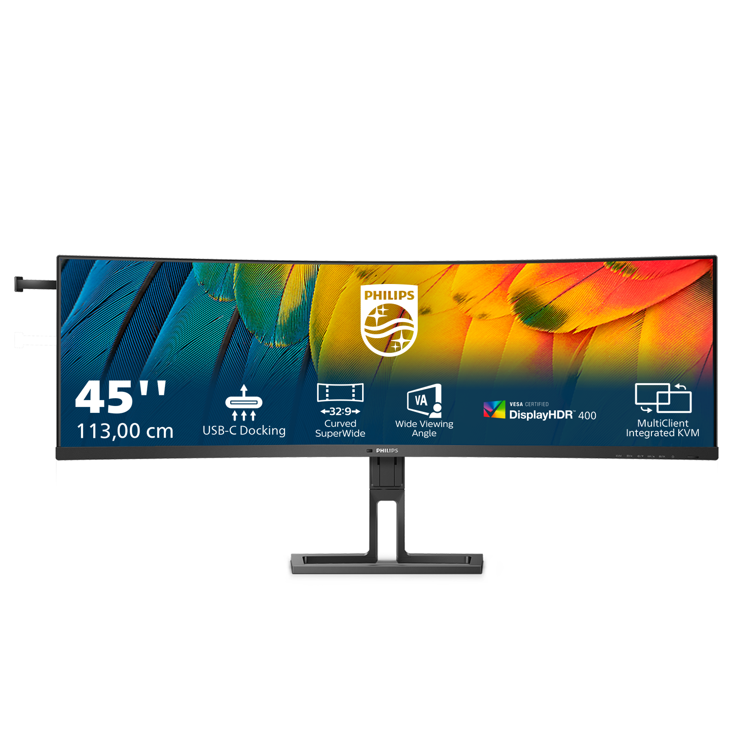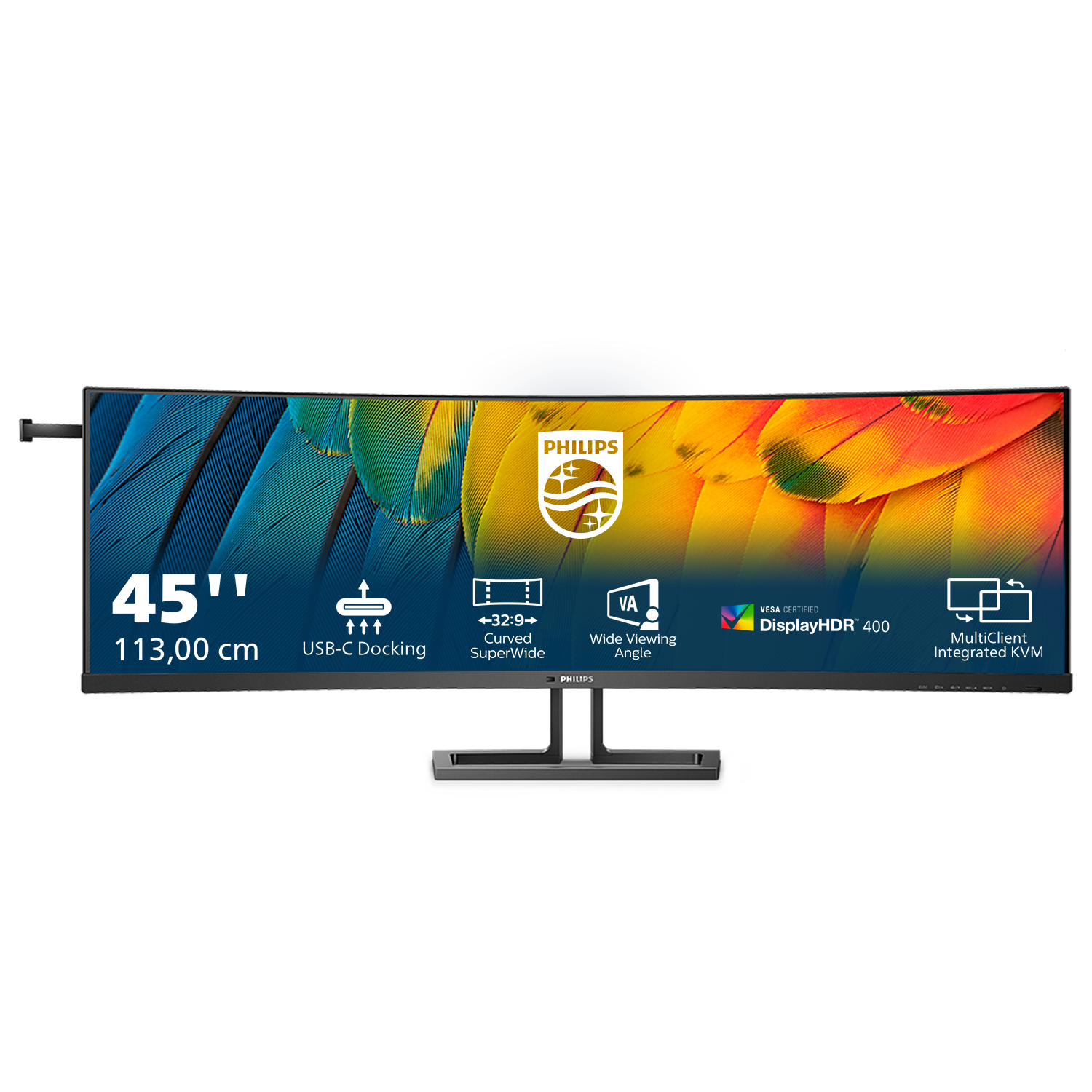 RJ-45 to USB-C gives easy network connection with security Simplify all peripherals from monitor to PC using one-cable-docking USB Type-C connector, includes networking, high resolution video output from PC to monitor, and surfing on Internet without an additional network cable, even without LAN port on your notebook. RJ45 connection through USB-C offers a fast and secure connection when needed. Getting the fastest data speeds allows you to transfer data from a HDD to your PC faster than ever. Additionally, USB-C with power delivery can even enable you to power and charge your notebook from the monitor, eliminating the need for extra power cables. Curved display design for more immersive experience Desktop monitors offer a personal user experience, which suits a curve design very well. The curved screen provides a pleasant yet subtle immersion effect, which focuses on you at the center of your desk. Eyesafe certified blue light protection and color accuracy Philips display meets TUV Rheinland Eyesafe® standard to truly protect you from the long exposure to blue light. The always-on blue light filter not only helps reduce digital eye strain, but also guarantees color integrity. Tilt, swivel and height-adjust for an ideal viewing position The Compact Ergo Base is a people-friendly Philips monitor base that tilts, swivels and height-adjusts so each user can position the monitor for maximum viewing comfort and efficiency. PowerSensor saves up to 80% energy costs PowerSensor is a built-in 'people sensor' that transmits and receives harmless infrared signals to determine if user is present and automatically reduces monitor brightness when user steps away from the desk, cutting energy costs by up to 80 percent and prolonging monitor life DisplayHDR 400 for more lifelike and outstanding visuals VESA-certified DisplayHDR 400 delivers a significant step-up from normal SDR displays. Unlike, other 'HDR compatible' screens, true DisplayHDR 400 produces astonishing brightness, contrast and colors. With global dimming and minimum 400 nits brightness, images come to life with notable highlights while featuring deeper, more nuanced blacks. It renders a fuller palette of rich new colors, delivering a visual experience that engages your senses. VA display delivers awesome images with wide viewing angles Philips VA LED display uses an advanced multi-domain vertical alignment technology which gives you super-high static contrast ratios for extra vivid and bright images. While standard office applications are handled with ease, it is especially suitable for photos, web-browsing, movies, gaming, and demanding graphical applications. It's optimized pixel management technology gives you 178/178 degree extra wide viewing angle, resulting in crisp images. Built-in stereo speakers for multimedia A pair of high quality stereo speakers built into a display device. It can be visible front firing, or invisible down firing, top firing, rear firing, etc depending on model and design. Built-in KVM switch to easily switch between sources With MultiClient Integrated KVM switch, you can control two separate PCs with one monitor-keyboard-mouse set up. A convenient button allows you to quickly switch between sources. Handy with set-ups that require dual PC computing power or sharing one large monitor to show two different PCs. 32:9 SuperWide: for replacing multiscreen setups This monitor's 32:9 SuperWide screen provides users with the ultimate replacement for a multi-screen desktop. With a singular 44.5-inch screen that is equivalent to two 23.8-inch 16:9 QHD monitors, it allows users to work seamlessly without having to daisy chain and increases productivity by offering users a large screen to open complex spreadsheets and view videos in their full form. |