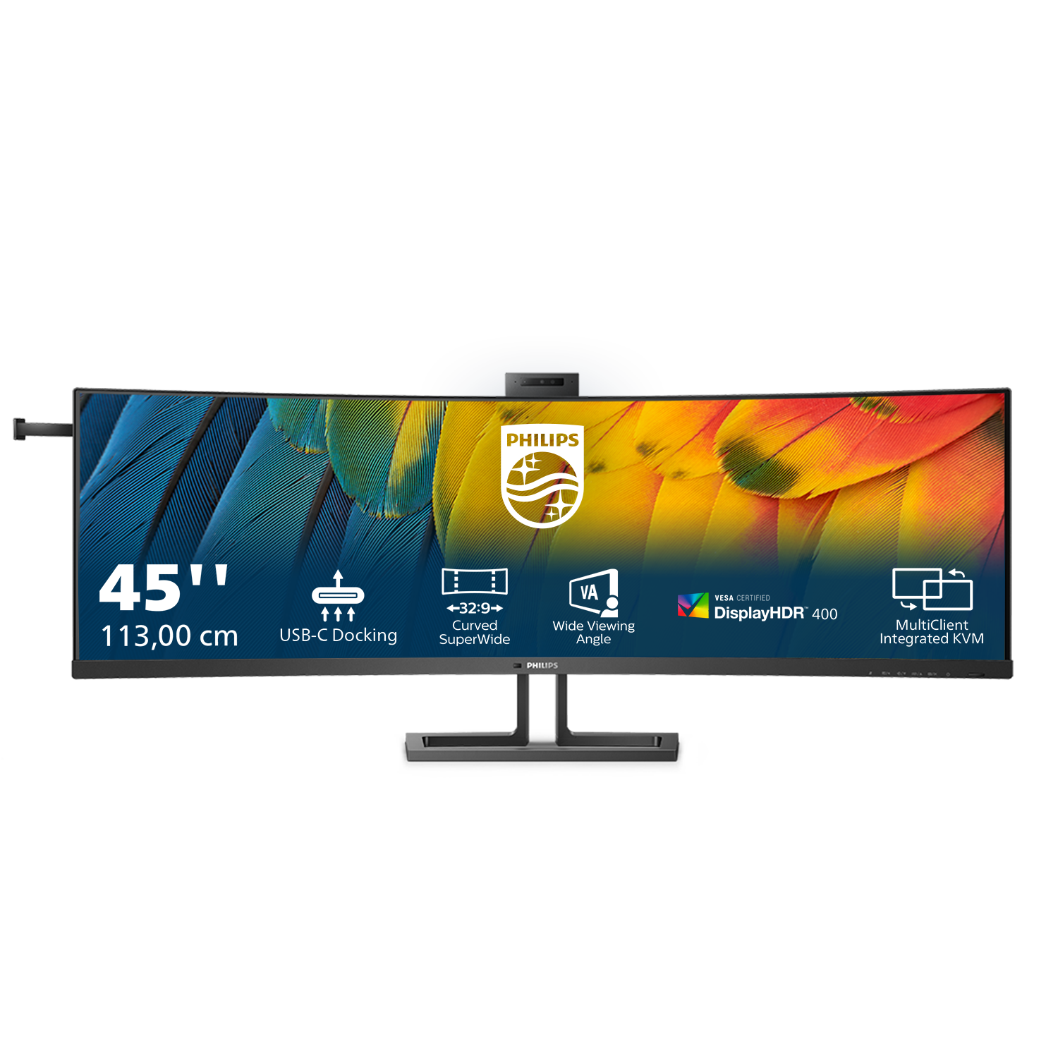 Curved display design for more immersive experience Desktop monitors offer a personal user experience, which suits a curve design very well. The curved screen provides a pleasant yet subtle immersion effect, which focuses on you at the center of your desk. Built-in KVM switch to easily switch between sources With MultiClient Integrated KVM switch, you can control two separate PCs with one monitor-keyboard-mouse set up. A convenient button allows you to quickly switch between sources. Handy with set-ups that require dual PC computing power or sharing one large monitor to show two different PCs. Collaboration-ready webcam with noise-cancelling mic. This Philips monitor comes with a built-in 5MP webcam, noise-cancelling microphone, and speakers, making it perfect for working from home and collaborating remotely. It is equipped with advanced sensors that work seamlessly with Windows Hello facial recognition, allowing you to log into your Windows devices in less than 2 seconds. For added privacy, a physical camera switch lets you disable the webcam when not in use. The noise-cancelling microphone and dual 5-watt integrated speakers ensure clear communication. Eyesafe certified blue light protection and color accuracy Philips display meets TUV Rheinland Eyesafe® standard to truly protect you from the long exposure to blue light. The always-on blue light filter not only helps reduce digital eye strain, but also guarantees color integrity. PowerSensor saves up to 80% energy costs PowerSensor is a built-in 'people sensor' that transmits and receives harmless infrared signals to determine if user is present and automatically reduces monitor brightness when user steps away from the desk, cutting energy costs by up to 80 percent and prolonging monitor life DisplayHDR 400 for more lifelike and outstanding visuals VESA-certified DisplayHDR 400 delivers a significant step-up from normal SDR displays. Unlike, other 'HDR compatible' screens, true DisplayHDR 400 produces astonishing brightness, contrast and colors. With global dimming and minimum 400 nits brightness, images come to life with notable highlights while featuring deeper, more nuanced blacks. It renders a fuller palette of rich new colors, delivering a visual experience that engages your senses. VA display delivers awesome images with wide viewing angles Philips VA LED display uses an advanced multi-domain vertical alignment technology which gives you super-high static contrast ratios for extra vivid and bright images. While standard office applications are handled with ease, it is especially suitable for photos, web-browsing, movies, gaming, and demanding graphical applications. It's optimized pixel management technology gives you 178/178 degree extra wide viewing angle, resulting in crisp images. RJ-45 to USB-C gives easy network connection with security Simplify all peripherals from monitor to PC using one-cable-docking USB Type-C connector, includes networking, high resolution video output from PC to monitor, and surfing on Internet without an additional network cable, even without LAN port on your notebook. RJ45 connection through USB-C offers a fast and secure connection when needed. Getting the fastest data speeds allows you to transfer data from a HDD to your PC faster than ever. Additionally, USB-C with power delivery can even enable you to power and charge your notebook from the monitor, eliminating the need for extra power cables. 32:9 SuperWide: for replacing multiscreen setups This monitor's 32:9 SuperWide screen provides users with the ultimate replacement for a multi-screen desktop. With a singular 44.5-inch screen that is equivalent to two 23.8-inch 16:9 QHD monitors, it allows users to work seamlessly without having to daisy chain and increases productivity by offering users a large screen to open complex spreadsheets and view videos in their full form. Secure sign-in with pop-up webcam Philips' innovative and secure webcam pops up when you need it and securely tucks back into the monitor when you are not using it. The webcam is also equipped with advanced sensors for Windows Hello facial recognition, which conveniently logs you into your Windows devices in less than 2 seconds, 3 times faster than a password. Windows Hello Certified – Seamless, Secure Access Log in faster and more securely with Windows Hello. This Philips monitor is Windows Hello Certified, offering quick facial recognition and effortless access - every time you power on. |
