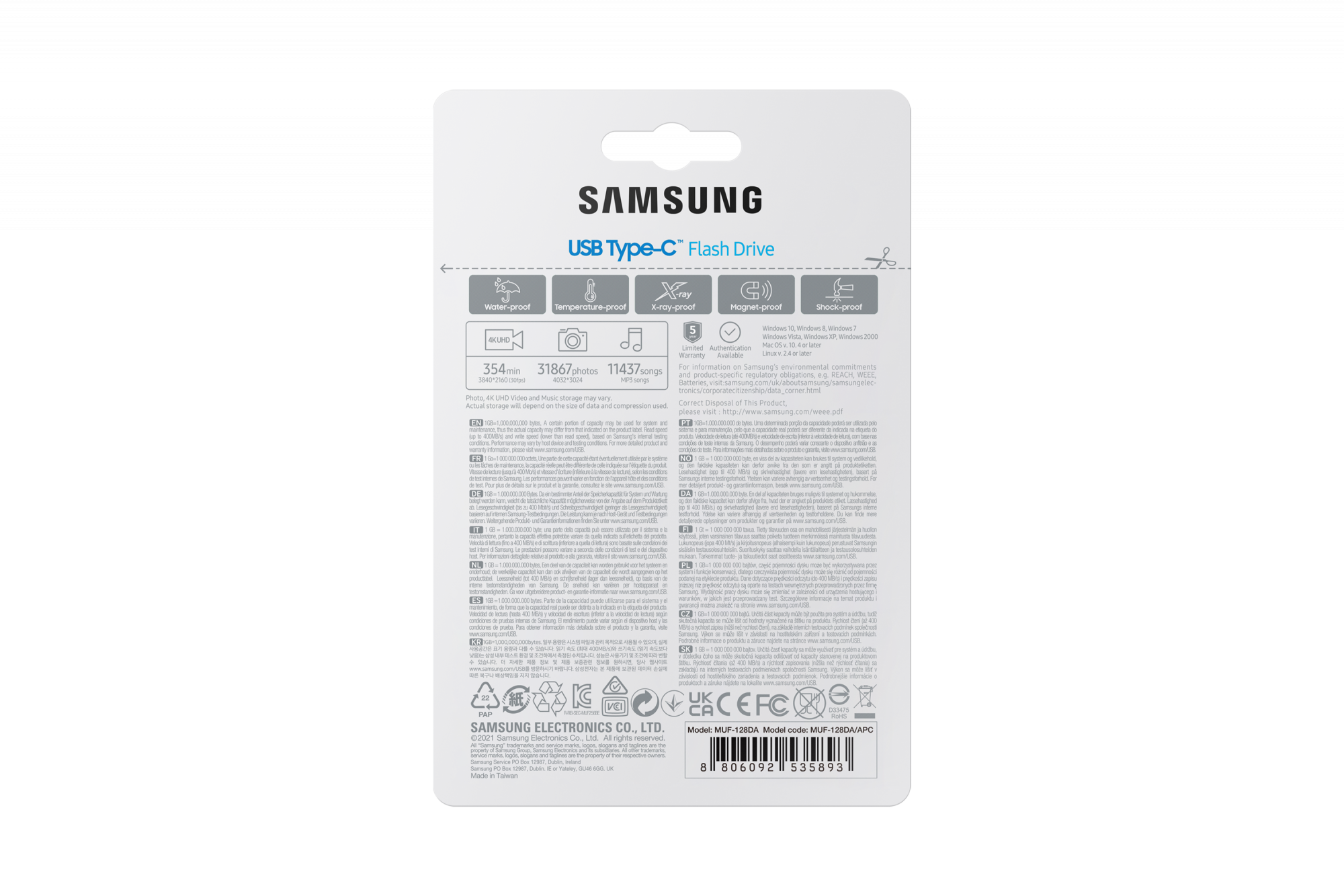Samsung MUF-128DA. Capacity: 128 GB, Device interface: USB Type-C, USB version: 3.2 Gen 1 (3.1 Gen 1), Read speed: 400 MB/s. Form factor: Cap. Weight: 3.4 g. Product colour: Blue