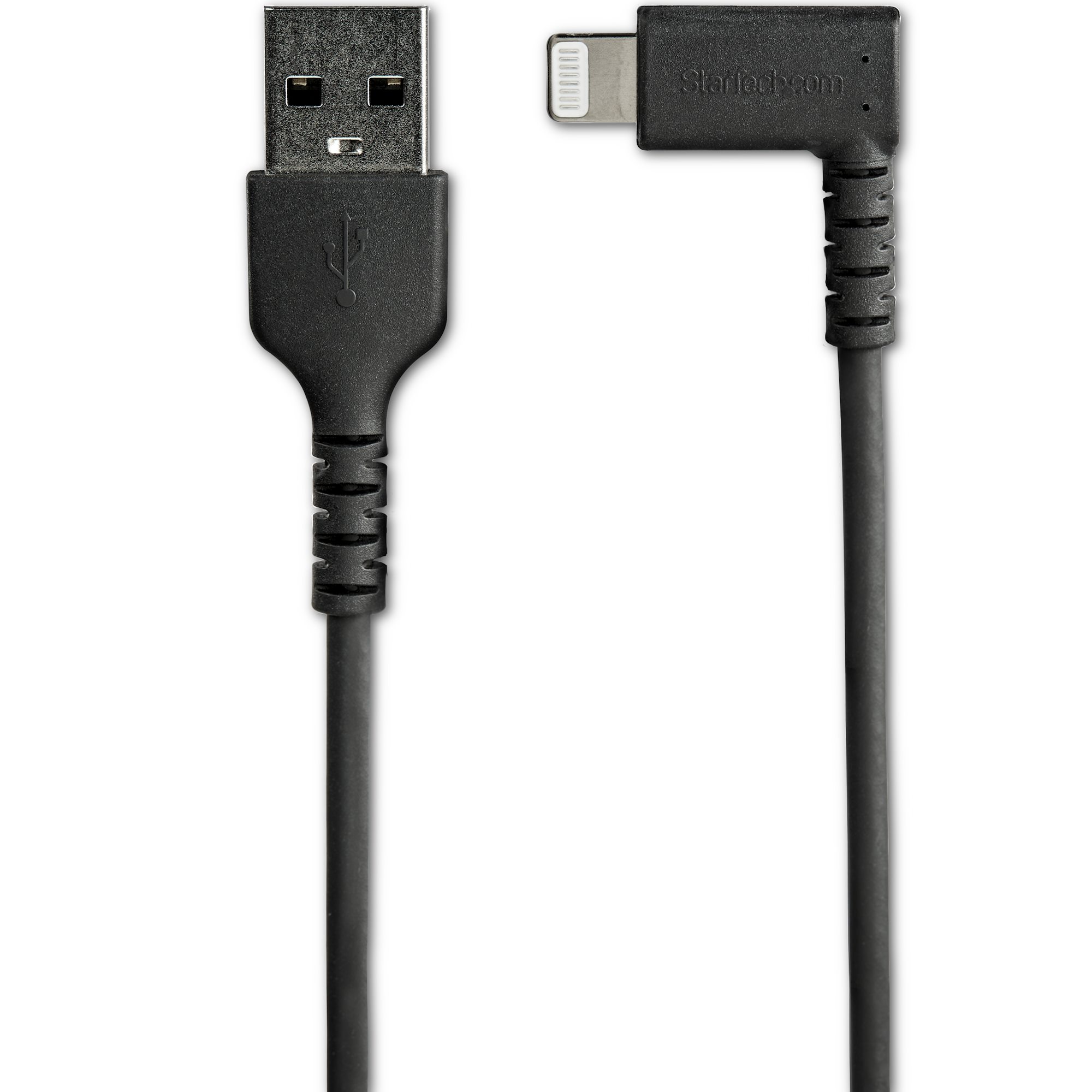 StarTech.com 3ft (1m) Durable USB A to Lightning Cable - Black 90° Right Angled Heavy Duty Rugged Aramid Fiber USB Type A to Lightning Charging/Sync Cord - Apple MFi Certified - iPhone. Cable length: 1 m, Connector 1: Lightning, Connector 2: USB A. Compliance certificates: RoHS. Weight: 26 g. Quantity per pack: 1 pc(s), Package width: 75 mm, Package depth: 145 mm. Master (outer) case width: 330 mm, Master (outer) case length: 400 mm, Master (outer) case height: 270 mm