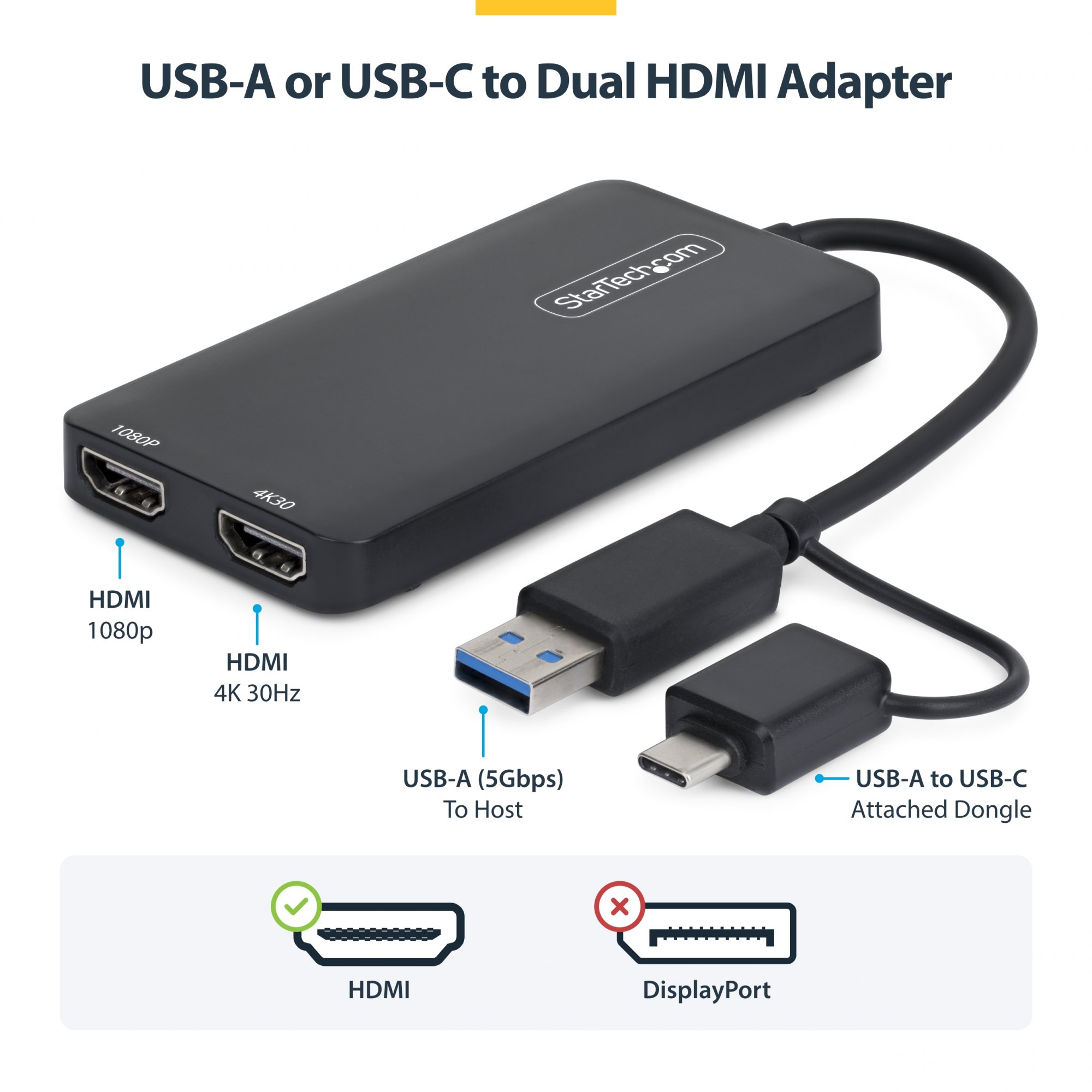 StarTech.com USB to Dual HDMI Adapter, USB A/C to 2x HDMI Displays (1x 4K30Hz, 1x 1080p), Integrated USB-A to C Dongle, 4in/11cm Cable, USB 3.0 to HDMI Display Adapter, Windows & macOS, USB Type-A, USB Type-C, HDMI output, 3840 x 2160 pixels