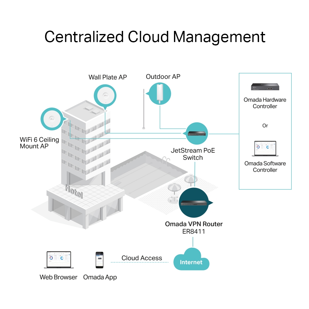 Centralized Management: Cloud access and Omada app for ultra convenience and easy management